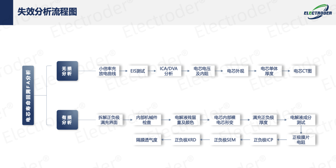 無(wú)損分析包括小倍率重放電曲線、EIS測(cè)試、電芯ICA/DVA測(cè)試、電芯電壓及內(nèi)阻、電芯外觀、電芯尺寸、電芯CT圖等環(huán)節(jié)。有損分析包括電極滿充界面、電芯機(jī)械件檢查、電解液殘留量及顏色、內(nèi)部卷芯形變確認(rèn)、陰陽(yáng)極厚度測(cè)量、電解液成分、正負(fù)極EDS等環(huán)節(jié)。