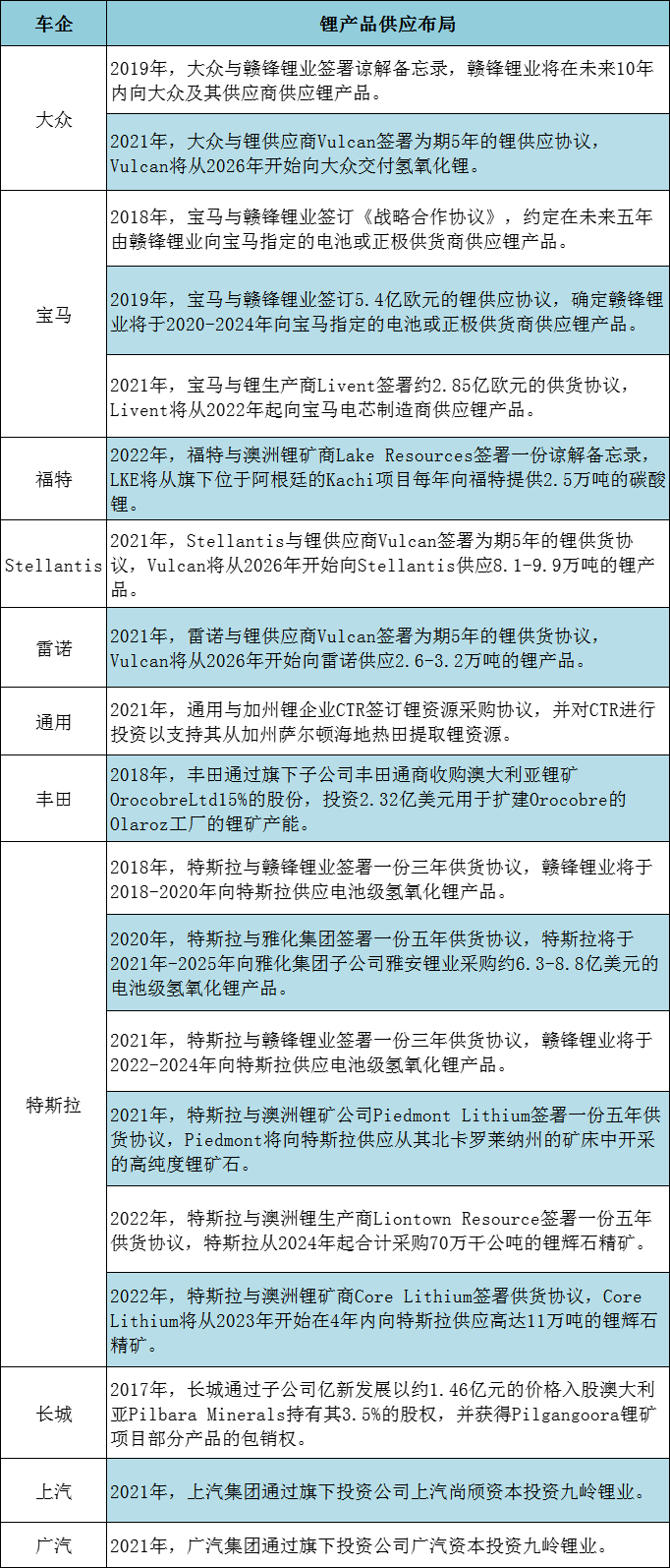 目前,包括特斯拉、大眾、寶馬、福特、Stellantis、雷諾等國際主機廠都簽署了鋰鹽/鋰精礦供貨長單,供貨期限普遍3-5年,最長甚至達10年,目的是為保障其鋰鹽供應穩定和維穩鋰鹽價格。