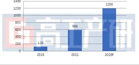 受鋰電池產業近兩年的擴產帶動,我國鋰電設備需求也在快速增長。據高工產研鋰電研究所(GGII)數據顯示,2021年中國鋰電生產設備市場規模為588億元,同比增長104.88%,較2015年的120億元增長了3.9倍。GGII預計未來幾年鋰電設備市場規模仍將高速增長,到2025年,中國鋰電設備市場規模將達1200億元,2021-2025年年均復合增速19.52%。