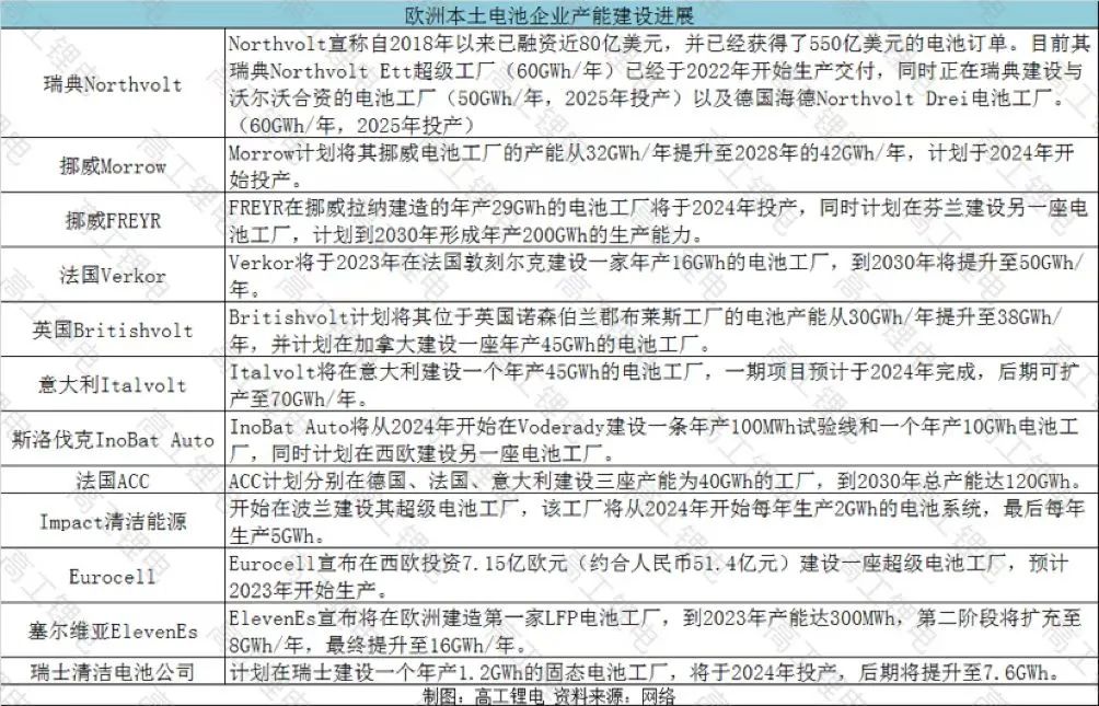 一個明顯的變化是,進入2022年以來,包括瑞典Northvolt、法國Verkor、法國ACC、斯洛伐克InoBat Auto、英國Britishvolt、挪威Freyr、挪威Morrow、意大利Italvolt、塞爾維亞ElevenEs等多家歐洲本土電池企業,都更新了其動力電池工廠建設計劃,建設進度明顯提速。